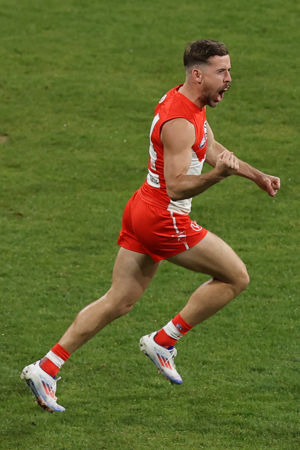SYDNEY, AUSTRALIA - JUNE 22: Jake Lloyd of the Swans celebrates a goal during the round 15 AFL match between Greater Western Sydney Giants and Sydney Swans at ENGIE Stadium on June 22, 2024 in Sydney, Australia. (Photo by Jason McCawley/AFL Photos)