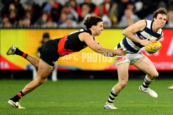 MELBOURNE, AUSTRALIA - JUNE 29: Max Holmes of the Cats is tackled by Nic Martin of the Bombers during the round 16 AFL match between Geelong Cats and Essendon Bombers at Melbourne Cricket Ground, on June 29, 2024, in Melbourne, Australia. (Photo by Josh Chadwick/AFL Photos)