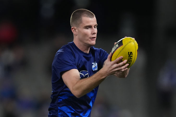 MELBOURNE, AUSTRALIA - JUNE 29: Luke McDonald of the Kangaroos warms up before the round 16 AFL match between North Melbourne Kangaroos and Western Bulldogs at Marvel Stadium, on June 29, 2024, in Melbourne, Australia. (Photo by Daniel Pockett/Getty Images via AFL Photos)