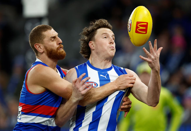 MELBOURNE, AUSTRALIA - JUNE 29: Jamarra Ugle-Hagan of the Bulldogs breaks a tackle attempt from Luke McDonald of the Kangaroos during the round 16 AFL match between North Melbourne Kangaroos and Western Bulldogs at Marvel Stadium, on June 29, 2024, in Melbourne, Australia. (Photo by Daniel Pockett/Getty Images via AFL Photos)