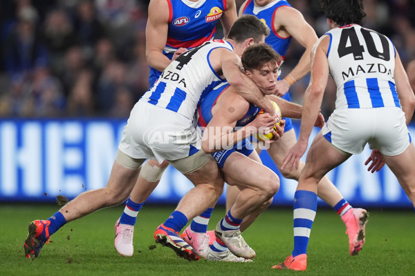 MELBOURNE, AUSTRALIA - JUNE 29: Harvey Gallagher of the Bulldogs is tackled by Liam Shiels of the Kangaroos during the round 16 AFL match between North Melbourne Kangaroos and Western Bulldogs at Marvel Stadium, on June 29, 2024, in Melbourne, Australia. (Photo by Daniel Pockett/Getty Images via AFL Photos)