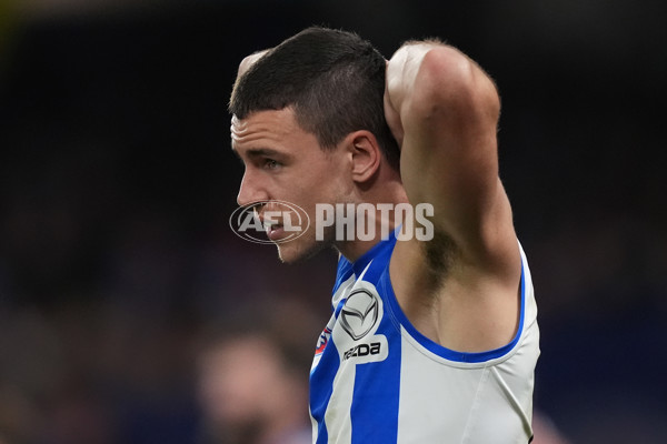 MELBOURNE, AUSTRALIA - JUNE 29: Luke Davies-Uniacke of the Kangaroos reacts after a contest with Aaron Naughton of the Bulldogs during the round 16 AFL match between North Melbourne Kangaroos and Western Bulldogs at Marvel Stadium, on June 29, 2024, in Melbourne, Australia. (Photo by Daniel Pockett/Getty Images via AFL Photos)