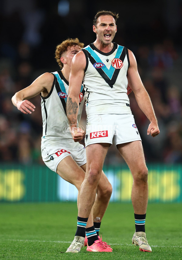 MELBOURNE, AUSTRALIA - JUNE 30: Jeremy Finlayson of the Power is congratulated by Logan Evans after kicking a goal during the round 16 AFL match between St Kilda Saints and Port Adelaide Power at Marvel Stadium, on June 30, 2024, in Melbourne, Australia. (Photo by Quinn Rooney/Getty Images via AFL Photos)