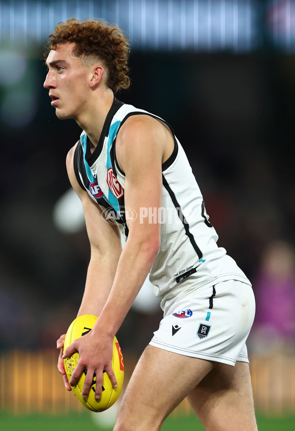 MELBOURNE, AUSTRALIA - JUNE 30: Logan Evans of the Power kicks during the round 16 AFL match between St Kilda Saints and Port Adelaide Power at Marvel Stadium, on June 30, 2024, in Melbourne, Australia. (Photo by Quinn Rooney/Getty Images via AFL Photos)