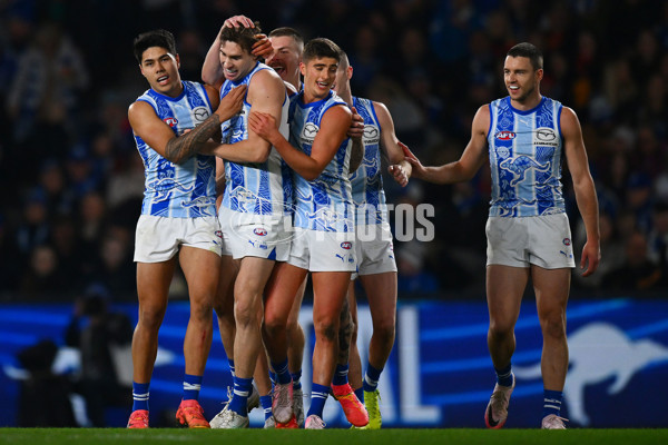MELBOURNE, AUSTRALIA - JULY 06: Kallan Dawson of the Kangaroos celebrates his first AFL goal during the round 17 AFL match between North Melbourne Kangaroos and Gold Coast Suns at Marvel Stadium, on July 06, 2024, in Melbourne, Australia. (Photo by Morgan Hancock/AFL Photos)