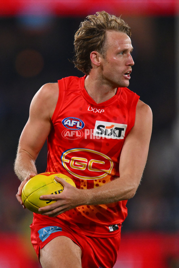 MELBOURNE, AUSTRALIA - JULY 06: Jack Lukosius of the Suns runs with the ball during the round 17 AFL match between North Melbourne Kangaroos and Gold Coast Suns at Marvel Stadium, on July 06, 2024, in Melbourne, Australia. (Photo by Morgan Hancock/AFL Photos)