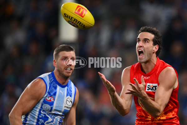 MELBOURNE, AUSTRALIA - JULY 06: Ben King of the Suns marks the ball during the round 17 AFL match between North Melbourne Kangaroos and Gold Coast Suns at Marvel Stadium, on July 06, 2024, in Melbourne, Australia. (Photo by Morgan Hancock/AFL Photos)
