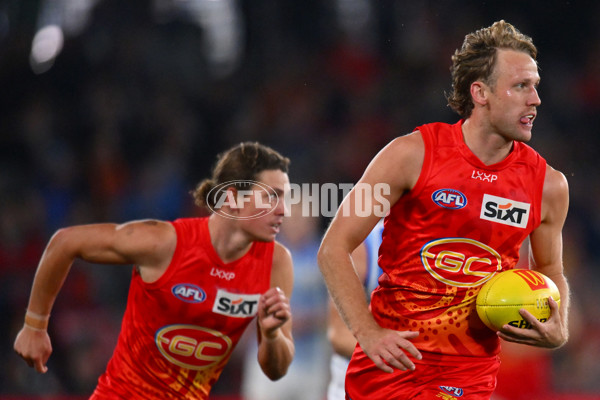 MELBOURNE, AUSTRALIA - JULY 06: Jack Lukosius of the Suns runs with the ball during the round 17 AFL match between North Melbourne Kangaroos and Gold Coast Suns at Marvel Stadium, on July 06, 2024, in Melbourne, Australia. (Photo by Morgan Hancock/AFL Photos)