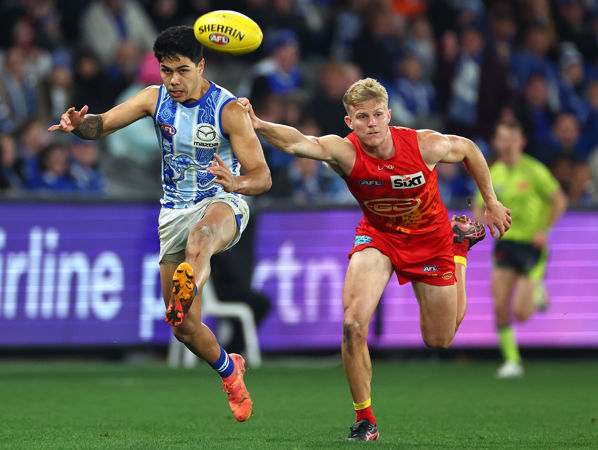 MELBOURNE, AUSTRALIA - JULY 06: Cameron Zurhaar of the Kangaroos kicks whilst being tackled by Thomas Berry and Matt Rowell of the Suns during the round 17 AFL match between North Melbourne Kangaroos and Gold Coast Suns at Marvel Stadium, on July 06, 2024, in Melbourne, Australia. (Photo by Quinn Rooney/Getty Images via AFL Photos)