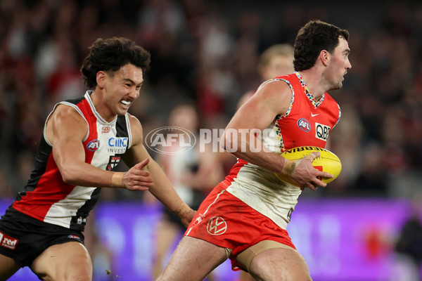 MELBOURNE, AUSTRALIA - JULY 07: Tom McCartin of the Swans runs with the ball during the round 17 AFL match between St Kilda Saints and Sydney Swans at Marvel Stadium, on July 07, 2024, in Melbourne, Australia. (Photo by Kelly Defina/Getty Images via AFL Photos)