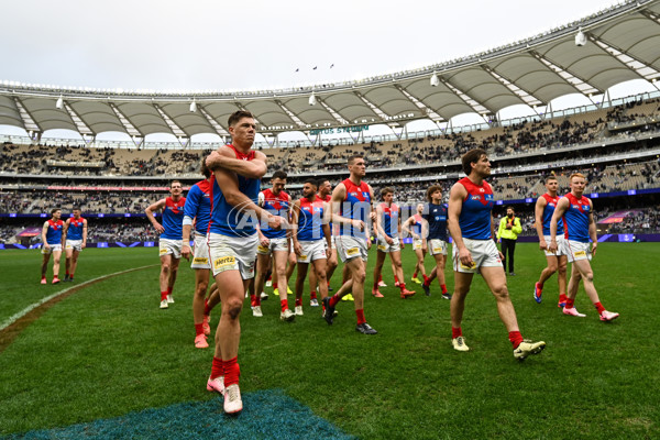 PERTH, AUSTRALIA - JULY 21: The Demons leave the field after the loss during the 2024 AFL Round 19 match between the Fremantle Dockers and the Melbourne Demons at Optus Stadium on July 21, 2024 in Perth, Australia. (Photo by Daniel Carson/AFL Photos)