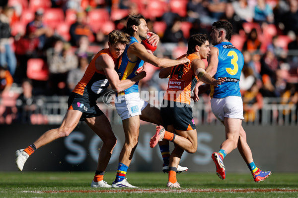 SYDNEY, AUSTRALIA - JULY 20: Lachie Weller of the Suns is tackled by Lachie Whitfield of the Giants during the 2024 AFL Round 19 match between the GWS GIANTS and the Gold Coast Suns at ENGIE Stadium on July 20, 2024 in Sydney, Australia. (Photo by Dylan Burns/AFL Photos)