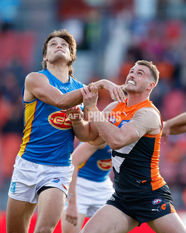 SYDNEY, AUSTRALIA - JULY 20: Ned Moyle of the Suns and Kieren Briggs of the Giants compete in a ruck contest during the 2024 AFL Round 19 match between the GWS GIANTS and the Gold Coast Suns at ENGIE Stadium on July 20, 2024 in Sydney, Australia. (Photo by Dylan Burns/AFL Photos)