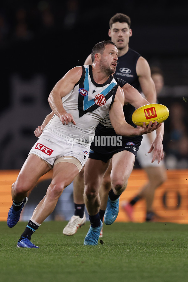 MELBOURNE, AUSTRALIA - JULY 26: Travis Boak of the Power handballs during the round 20AFL match between Carlton Blues and Port Adelaide Power at Marvel Stadium, on July 26, 2024, in Melbourne, Australia. (Photo by Darrian Traynor/Getty Images via AFL Photos)
