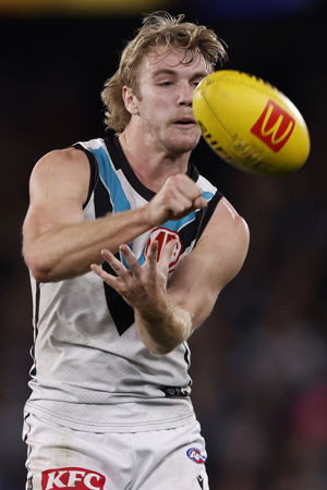 MELBOURNE, AUSTRALIA - JULY 26: Jason Horne-Francis of the Power handballs during the round 20AFL match between Carlton Blues and Port Adelaide Power at Marvel Stadium, on July 26, 2024, in Melbourne, Australia. (Photo by Darrian Traynor/Getty Images via AFL Photos)