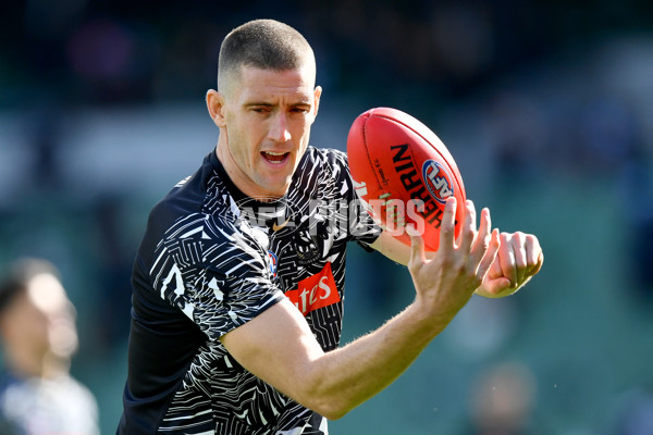 MELBOURNE, AUSTRALIA - JULY 28: Darcy Cameron of the Magpies warms up prior to the round 20 AFL match between Collingwood Magpies and Richmond Tigers at Melbourne Cricket Ground, on July 28, 2024, in Melbourne, Australia. (Photo by Josh Chadwick/Getty Images via AFL Photos)