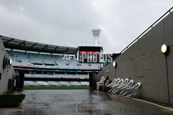 MELBOURNE, AUSTRALIA - JULY 28: General scenes as rain falls before the 2024 AFL Round 20 match between the Collingwood Magpies and the Richmond Tigers at the Melbourne Cricket Ground on July 28, 2024 in Melbourne, Australia. (Photo by Dylan Burns/AFL Photos)