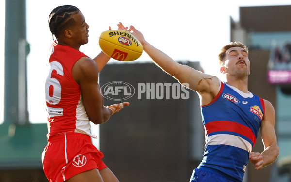 SYDNEY, AUSTRALIA - JULY 28: Joel Amartey of the Swans and Rhylee West of the Bulldogs compete for the ball during the 2024 AFL Round 20 match between the Sydney Swans and the Western Bulldogs at The Sydney Cricket Ground on July 28, 2024 in Sydney, Australia. (Photo by Michael Willson/AFL Photos)