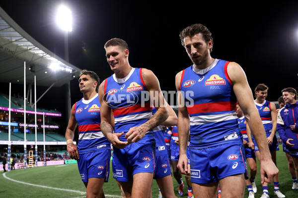 SYDNEY, AUSTRALIA - JULY 28: Bulldogs players celebrate as they leave the field during the round 20 AFL match between Sydney Swans and Western Bulldogs at SCG, on July 28, 2024, in Sydney, Australia. (Photo by Brendon Thorne/AFL Photos)