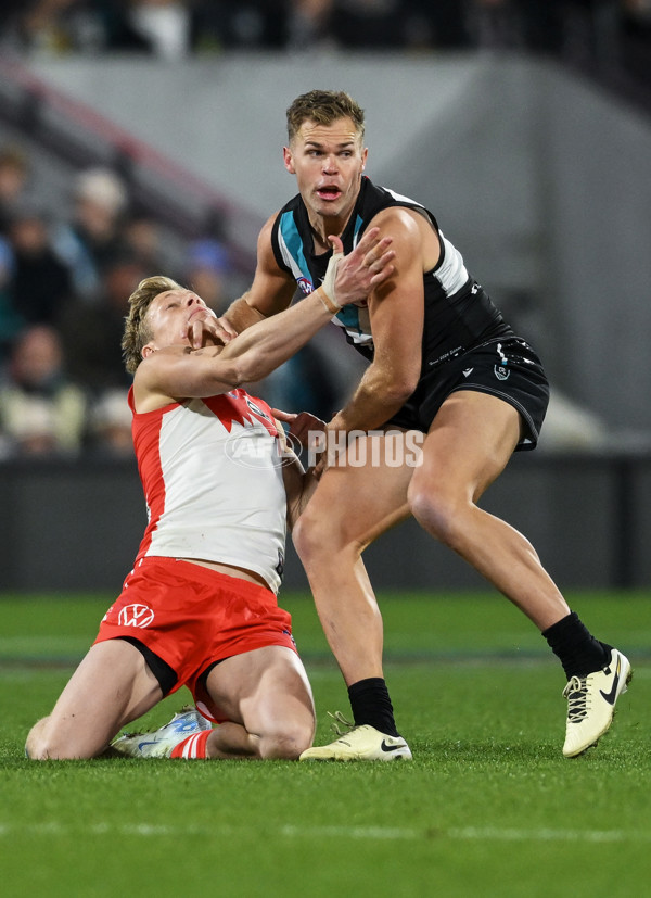 ADELAIDE, AUSTRALIA - AUGUST 03: Dan Houston of the Power competes with Isaac Heeney of the Swans during the round 21 AFL match between Port Adelaide Power and Sydney Swans at Adelaide Oval, on August 03, 2024, in Adelaide, Australia. (Photo by Mark Brake/Getty Images via AFL Photos)