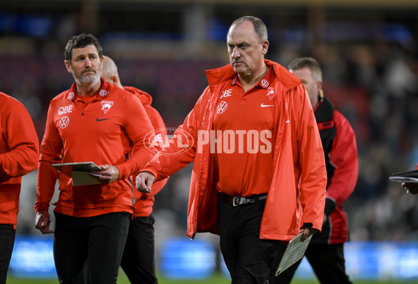 ADELAIDE, AUSTRALIA - AUGUST 03: John Longmire, Senior Coach of the Swans at half time during the round 21 AFL match between Port Adelaide Power and Sydney Swans at Adelaide Oval, on August 03, 2024, in Adelaide, Australia. (Photo by Mark Brake/Getty Images via AFL Photos)