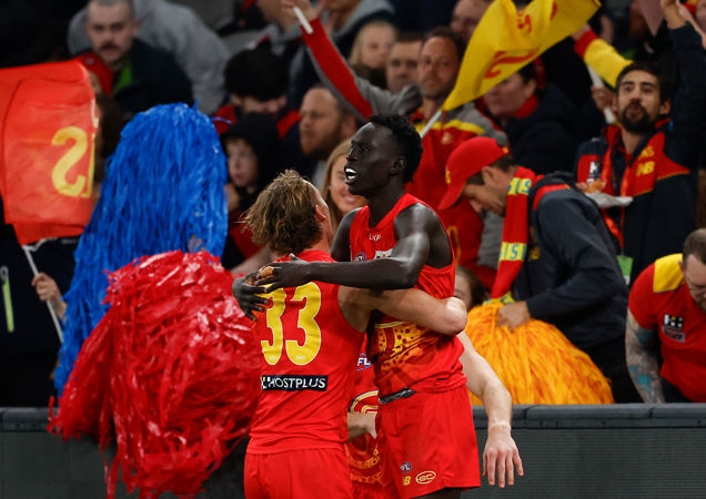 MELBOURNE, AUSTRALIA - AUGUST 10: Matt Rowell of the Suns in action during the round 22 AFL match between Essendon Bombers and Gold Coast Suns at Marvel Stadium, on August 10, 2024, in Melbourne, Australia. (Photo by Jonathan DiMaggio/Getty Images via AFL Photos)