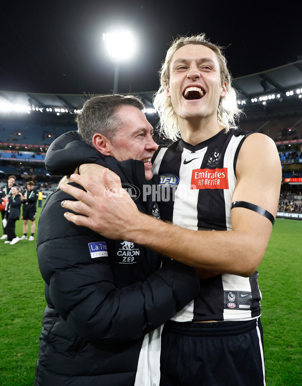 MELBOURNE, AUSTRALIA - AUGUST 17: Craig McRae, Senior Coach of the Magpies and Darcy Moore of the Magpies celebrate during the 2024 AFL Round 23 match between the Collingwood Magpies and the Brisbane Lions at The Melbourne Cricket Ground on August 17, 2024 in Melbourne, Australia. (Photo by Michael Willson/AFL Photos)