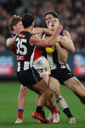 MELBOURNE, AUSTRALIA - AUGUST 17: Scott Pendlebury of the Magpies celebrates as the final siren sounds during the 2024 AFL Round 23 match between the Collingwood Magpies and the Brisbane Lions at The Melbourne Cricket Ground on August 17, 2024 in Melbourne, Australia. (Photo by Michael Willson/AFL Photos)