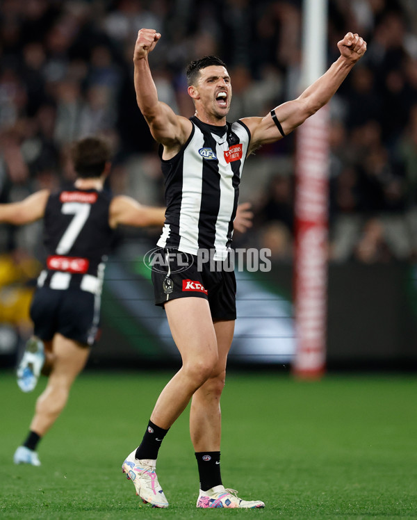 MELBOURNE, AUSTRALIA - AUGUST 17: Scott Pendlebury of the Magpies celebrates as the final siren sounds during the 2024 AFL Round 23 match between the Collingwood Magpies and the Brisbane Lions at The Melbourne Cricket Ground on August 17, 2024 in Melbourne, Australia. (Photo by Michael Willson/AFL Photos)