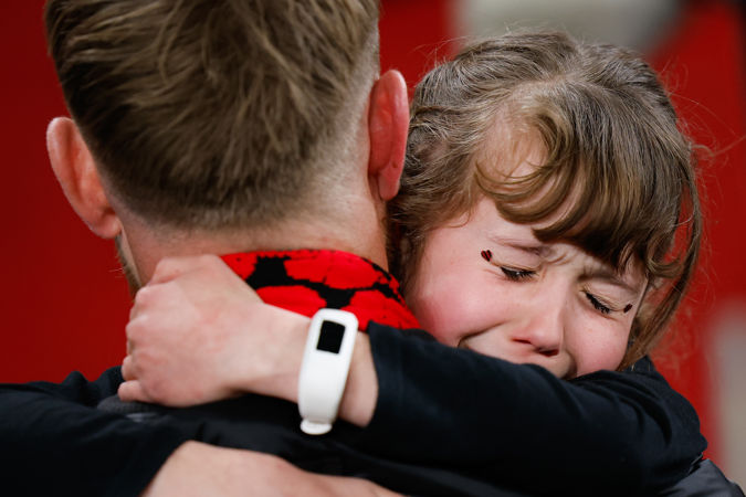 MELBOURNE, AUSTRALIA - AUGUST 16: Dyson Heppell of the Bombers is greeted by family and friends during the round 23 AFL match between Essendon Bombers and Sydney Swans at Marvel Stadium, on August 16, 2024, in Melbourne, Australia. (Photo by Daniel Pockett/Getty Images via AFL Photos)