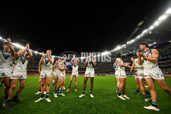 PERTH, AUSTRALIA - AUGUST 25: The Power celebrate the win during the 2024 AFL Round 24 match between the Fremantle Dockers and the Port Adelaide Power at Optus Stadium on August 25, 2024 in Perth, Australia. (Photo by Daniel Carson/AFL Photos)