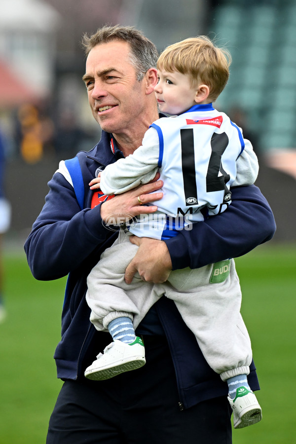 LAUNCESTON, AUSTRALIA - AUGUST 24: Alastair Clarkson, Senior Coach of the Kangaroos is seen holding the son of Liam Shiels of the Kangaroos as he warms up during the round 24 AFL match between Hawthorn Hawks and North Melbourne Kangaroos at University of Tasmania Stadium, on August 24, 2024, in Launceston, Australia. (Photo by Steve Bell/AFL Photos)
