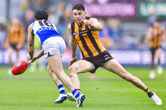 LAUNCESTON, AUSTRALIA - AUGUST 24: Conor Nash of the HAwks kicks during the round 24 AFL match between Hawthorn Hawks and North Melbourne Kangaroos at University of Tasmania Stadium, on August 24, 2024, in Launceston, Australia. (Photo by Simon Sturzaker/AFL Photos)