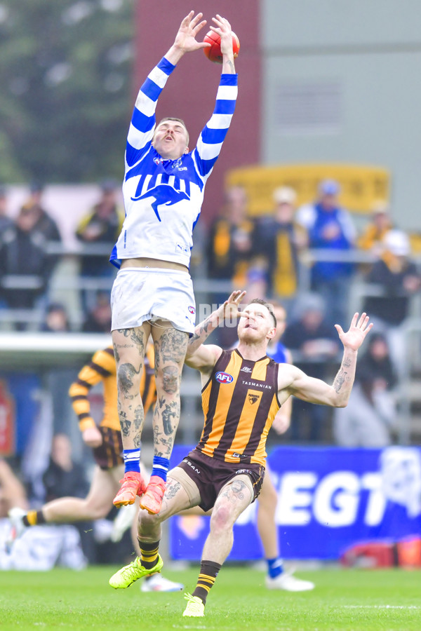 LAUNCESTON, AUSTRALIA - AUGUST 24: Cameron Zuhaar of the Kangaroos attempts to mark the ball during the round 24 AFL match between Hawthorn Hawks and North Melbourne Kangaroos at University of Tasmania Stadium, on August 24, 2024, in Launceston, Australia. (Photo by Simon Sturzaker/AFL Photos)