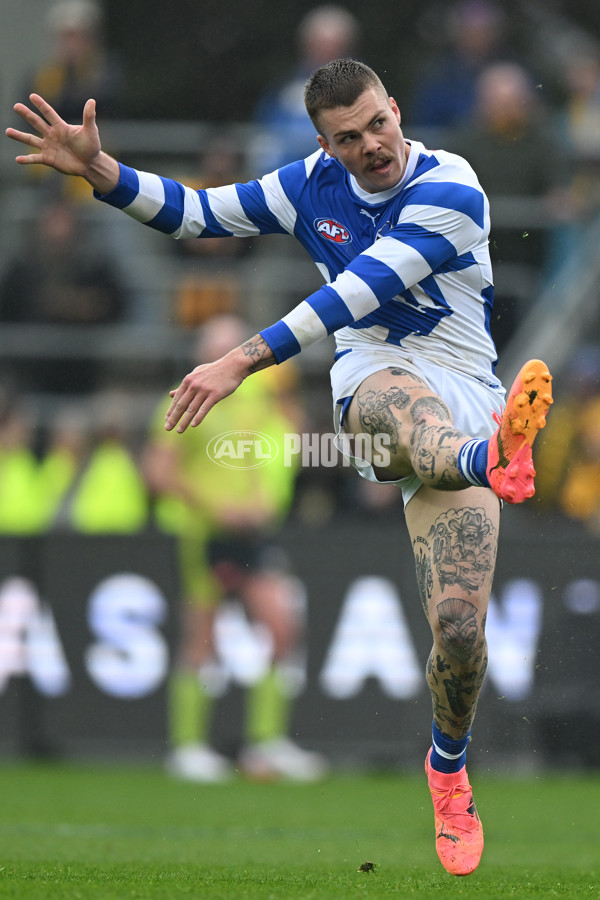 LAUNCESTON, AUSTRALIA - AUGUST 24: Cameron Zurhaar of the Kangaroos kicks the ball during the round 24 AFL match between Hawthorn Hawks and North Melbourne Kangaroos at University of Tasmania Stadium, on August 24, 2024, in Launceston, Australia. (Photo by Steve Bell/AFL Photos)