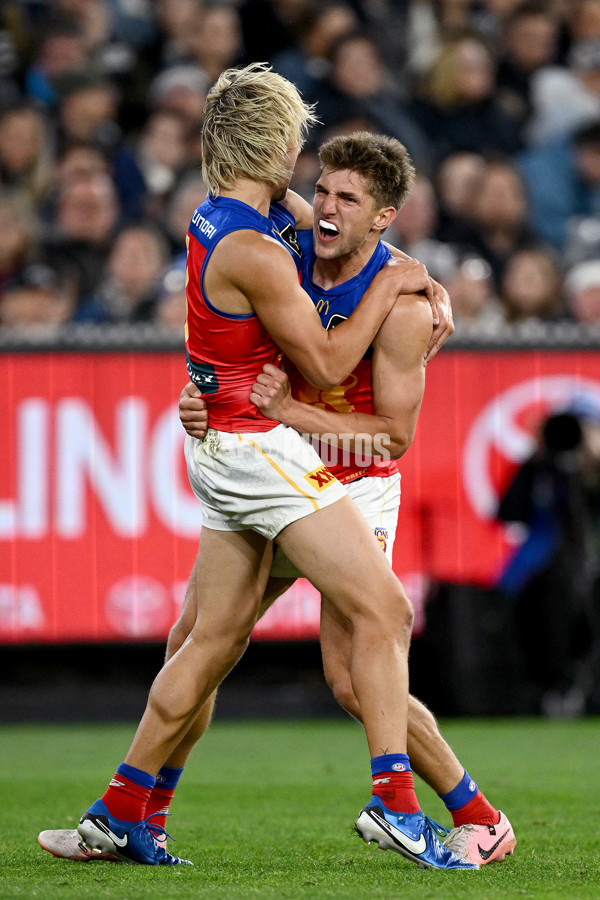 MELBOURNE, AUSTRALIA - SEPTEMBER 21: Zac Bailey of the Lions celebrates kicking a goal with Kai Lohmann of the Lions during the AFL Preliminary Final match between Geelong Cats and Brisbane Lions at Melbourne Cricket Ground, on September 21, 2024, in Melbourne, Australia. (Photo by Quinn Rooney/Getty Images via AFL Photos)