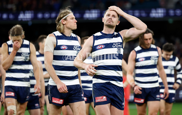 MELBOURNE, AUSTRALIA - SEPTEMBER 21: Patrick Dangerfield of the Cats looks dejected after a loss during the 2024 AFL Second Preliminary Final match between the Geelong Cats and the Brisbane Lions at The Melbourne Cricket Ground on September 21, 2024 in Melbourne, Australia. (Photo by Michael Willson/AFL Photos)