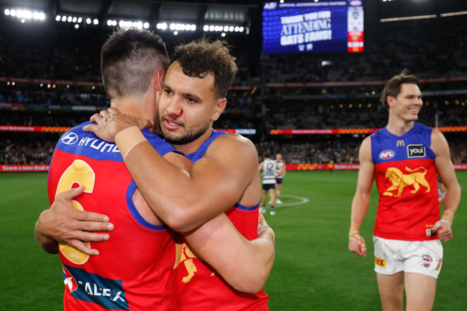 MELBOURNE, AUSTRALIA - SEPTEMBER 21: Jack Henry (ledt) and Oliver Henry of the Cats look dejected after a loss during the 2024 AFL Second Preliminary Final match between the Geelong Cats and the Brisbane Lions at The Melbourne Cricket Ground on September 21, 2024 in Melbourne, Australia. (Photo by Michael Willson/AFL Photos)