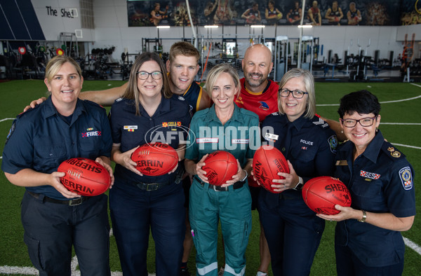 ADELAIDE, AUSTRALIA - MARCH 08: Nick Murray of the Crows and Matthew Nicks, Senior Coach of the Crows pose with emegency service women L-R MFS Celia Low,CFS Leah Bertholini ,SAAS Lisa Tilley,SAPOL Joanne Davey and SES Liz Connell the Crows are dedicating a match in honour of all emergency service workers and giving away free tickets before an Adelaide Crows AFL training session at West Lakes on March 08, 2024 in Adelaide, Australia. (Photo by Mark Brake/Getty Images via AFL Photos)