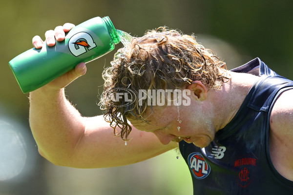 MELBOURNE, AUSTRALIA - NOVEMBER 22: Clayton Oliver of the Demons cools off by tipping water over his head during a Melbourne Demons AFL training session at Gosch's Paddock on November 22, 2024 in Melbourne, Australia. (Photo by Quinn Rooney/Getty Images via AFL Photos)