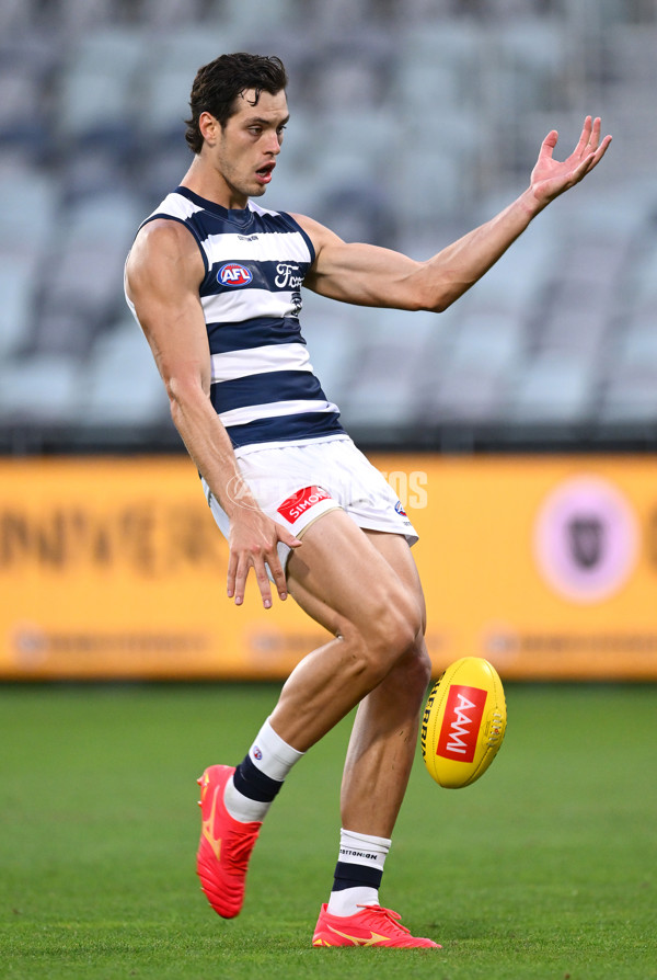 GEELONG, AUSTRALIA - FEBRUARY 25: Shannon Neale of the Cats kicks during the 2025 AAMI AFL Community Series match between Geelong Cats and Essendon Bombers at GMHBA Stadium on February 25, 2025 in Geelong, Australia. (Photo by Quinn Rooney/Getty Images via AFL Photos)
