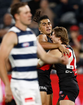 GEELONG, AUSTRALIA - FEBRUARY 25: Archie Roberts of the Bombers handballs during the 2025 AAMI AFL Community Series match between Geelong Cats and Essendon Bombers at GMHBA Stadium on February 25, 2025 in Geelong, Australia. (Photo by Quinn Rooney/Getty Images via AFL Photos)