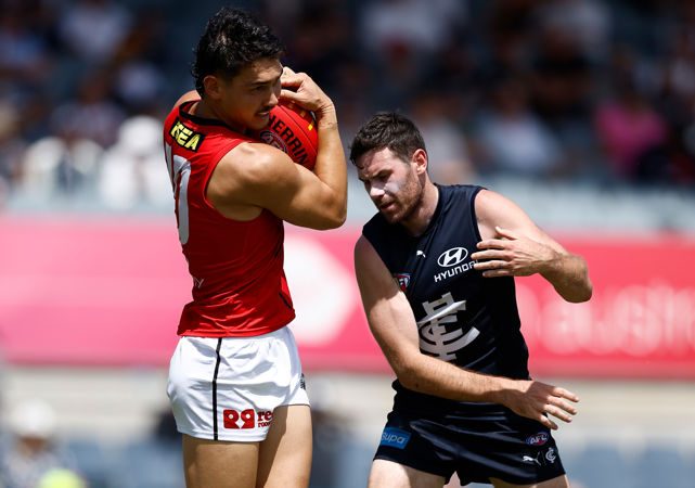 MELBOURNE, AUSTRALIA - FEBRUARY 22: Jack Macrae of the Saints kicks the ball during the 2025 AFL match simulation between the Carlton Blues and St Kilda Saints at Ikon Park on February 22, 2025 in Melbourne, Australia. (Photo by Michael Willson/AFL Photos)