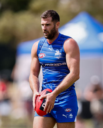 MELBOURNE, AUSTRALIA - FEBRUARY 22: Jack Darling of the Kangaroos kicks the ball during the 2025 AFL match simulation between the North Melbourne Kangaroos and Melbourne Demons at Arden Street on February 22, 2025 in Melbourne, Australia. (Photo by Dylan Burns/AFL Photos)