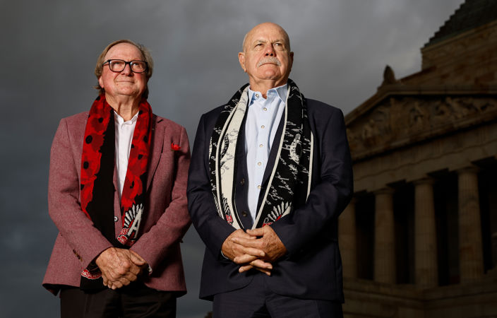 MELBOURNE, AUSTRALIA - APRIL 22: Kevin Sheedy (left) and Leigh Matthews (right) pose during the ANZAC Day Media Opportunity at the Shrine of Remembrance on April 22, 2025 in Melbourne, Australia. (Photo by Michael Willson/AFL Photos)