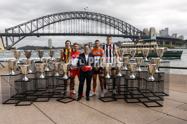 SYDNEY, AUSTRALIA - MARCH 03: AFL CEO Andrew Dillon poses for a photo with Mitch Lewis of the Hawks, Will Hayward of the Swans, Jesse Hogan of the Giants and Mason Cox of the Magpies during the 2025 AFL Opening Round Launch at Sydney Opera House on March 03, 2025 in Sydney, Australia. (Photo by Darrian Traynor/AFL Photos)