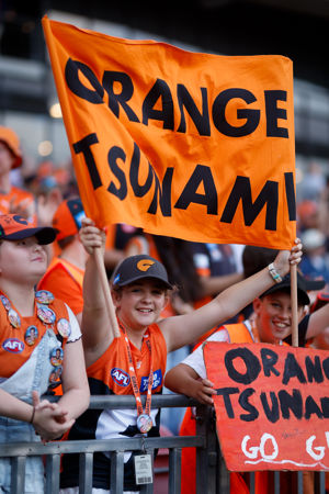SYDNEY, AUSTRALIA - MARCH 09: GWS Giants fans celebrate a win after the 2025 AFL Opening Round match between the GWS Giants and the Collingwood Magpies at ENGIE Stadium on March 9, 2025 in Sydney, Australia. (Photo by Dylan Burns/AFL Photos)