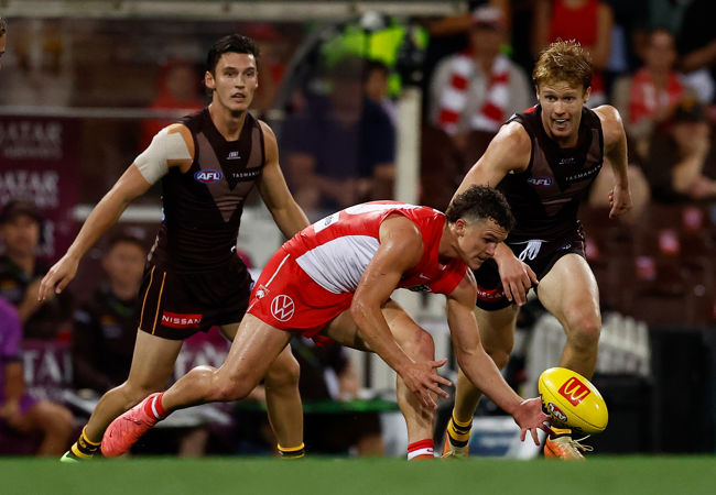 SYDNEY, AUSTRALIA - MARCH 07: Debutant, Tom Hanily of the Swans during the 2025 AFL Opening Round match between the Sydney Swans and the Hawthorn Hawks at the Sydney Cricket Ground on March 7, 2025 in Sydney, Australia. (Photo by Michael Willson/AFL Photos)