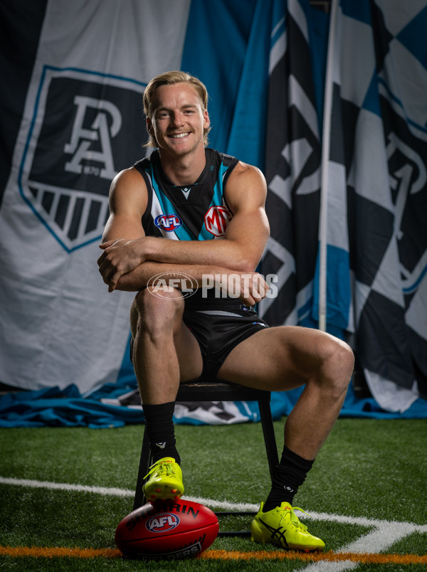 ADELAIDE, AUSTRALIA - JANUARY 30: Miles Bergman during the Port Adelaide Power 2025 Official Team Photo Day at Alberton Oval on January 30, 2025 in Adelaide, Australia. (Photo by Sarah Reed/AFL Photos)
