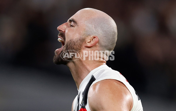 MELBOURNE, AUSTRALIA - MARCH 21: Steele Sidebottom of the Magpies celebrates as the final siren sounds during the 2025 AFL Round 02 match between the Footscray Bulldogs and the Collingwood Magpies at the Melbourne Cricket Ground on March 21, 2025 in Melbourne, Australia. (Photo by Michael Willson/AFL Photos)